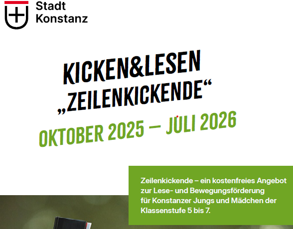 Das Projekt „Zeilenkickende“ geht in die nächste Runde! Zeilenkickende – ein kostenfreies Angebot zur Lese- und Bewegungsförderung für Konstanzer Jungs und Mädchen der Klassenstufe 5 bis 7. Die meisten Jungs greifen lieber zum Ball als zum Buch. Dass Lesen aber auch Spaß machen kann und cool ist, soll ihnen das Projekt „Zeilenkickende“ aufzeigen. In einem Zeitraum von Oktober 2025 bis Juli 2026 treffen sich die Jungs und Mädchen regelmäßig einmal die Woche zum gemeinsamen Lese-, Bewegungs- und Fußballtraining. Eine Projektwoche, ein Fußballcamp sowie viele weitere tolle Aktionen runden das Programm ab. Ziele Das Projekt „Zeilenkickende“ will einerseits die Lese- und Sprachkompetenz der Jungs und Mädchen verbessern, andererseits stehen die Stärkung der sozialen Fähigkeiten, die Kombination von Bildung und Bewegung, Integration und Gewaltprävention im Mittelpunkt. Spannende und abwechslungsreiche Lese- und Trainingseinheiten sorgen für Spaß und Interesse – sowohl am Lesen als auch am Fußball! Flyer kicken&lesen Anmeldebogen kicken&lesen Anmeldung & Informationen 📍 Amt für Bildung und Sport, Stadt Konstanz 📧 Lena.Hommel@konstanz.de 📞 +49 7531 900-2903 🏢 Benediktinerplatz 8 | 78467 Konstanz